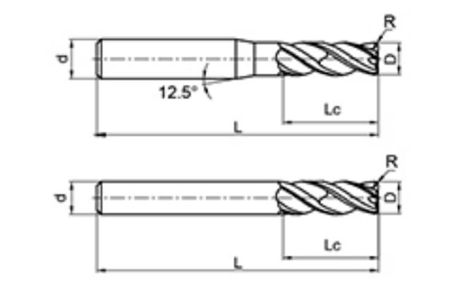 | Tidak. | Diameter D | Sudut R R | Panjang Seruling Lc | Panjang Keseluruhan L | Shank Dia d | Kiraan Bilah F |