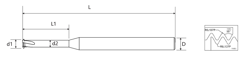 Pelbagai spesifikasi tersedia, meliputi diameter pemotong yang berbeza (d1), diameter pelepasan (d2), panjang pemotongan berkesan (L1), dan panjang keseluruhan (L), membenarkan kefleksibelan untuk pelbagai standard benang dan keperluan pemesinan. Reka bentuk batang silinder standard memastikan keserasian dengan pelbagai sistem pengapit alatan mesin, memberikan pegangan yang selamat dan kemudahan operasi.